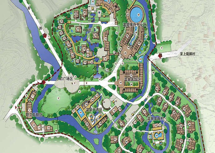 一條景觀主軸是通過大門區(qū)圓形廣場連系西端橋梁與東端溫泉賓館,并延伸至上部隴腳村,形成主要景觀游賞大道。二個溫泉旅游片區(qū);即北部公共溫泉接待片區(qū)、南部溫泉度假、療養(yǎng)片區(qū)。三塊自然臺地為北部鍋底箐峽谷河灘型臺地、南部田園風(fēng)光臺地、西北部山脊丘陵臺地。八個功能分區(qū)分別為入口廣場區(qū)、溫泉賓館區(qū)、溫泉接待中心區(qū)、公共溫泉區(qū)、VIP區(qū)、溫泉療養(yǎng)區(qū)、溫泉度假區(qū)、職工后勤區(qū)。