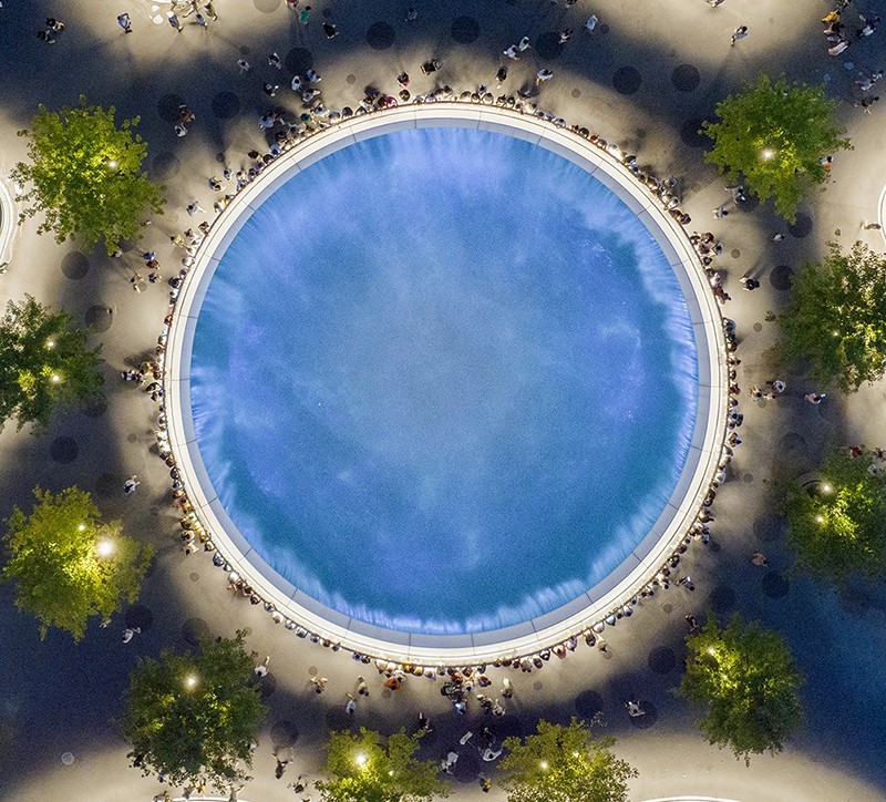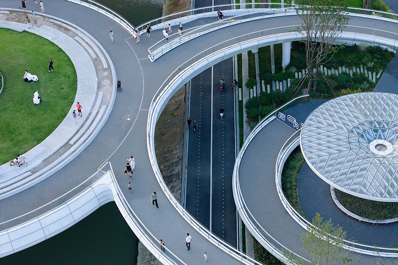 值得一提的是,橋上的 9 個圓盤單元雖大小各異,面積從 300 至 1600 平方米不等,但皆為同形異構(gòu)。圓盤之上精心栽種喬木,使之與河岸綠地綿延相連,仿若一座漂浮于錦江之上的空中公園。這 9 個圓盤單元既相互關(guān)聯(lián),構(gòu)成一個完整的景觀整體,又各自獨立,分化出 9 處風(fēng)格迥異、功能多樣的活動空間,全方位滿足市民休閑、娛樂、社交等多元需求。
