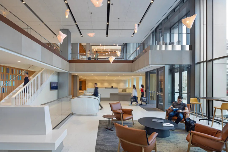 羅伯特-A-M-斯特恩建筑設(shè)計(jì)事務(wù)所(RAMSA)為位于華盛頓市中心喬治敦大學(xué)國(guó)會(huì)大廈校區(qū)的麥考特公共政策學(xué)院設(shè)計(jì)了一座新的旗艦建筑。這座新建筑占地 150,000 平方英尺,位于西北部 125 E 街,是學(xué)生、教師、研究人員以及活躍在美國(guó)首都的廣大決策社區(qū)的學(xué)術(shù)中心。大樓內(nèi)有大量的教育和社區(qū)空間,包括 20 間教室、一個(gè)寬敞的主公共空間、學(xué)術(shù)辦公室、一個(gè)可容納 400 人的禮堂,以及一個(gè)可俯瞰美國(guó)國(guó)會(huì)大廈全景的大型屋頂露臺(tái)和一個(gè)可容納 280 人的會(huì)場(chǎng)。作為一個(gè)致力于應(yīng)對(duì)復(fù)雜的國(guó)家和國(guó)際挑戰(zhàn)的學(xué)術(shù)中心,麥考特公共政策學(xué)院將可持續(xù)發(fā)展和能源效率放在首位,其設(shè)計(jì)目標(biāo)是獲得 LEED 白金級(jí)認(rèn)證。此外,由建筑師、設(shè)計(jì)師、藝術(shù)家和雕塑家瑪雅-林(Maya Lin)設(shè)計(jì)的一系列針對(duì)特定場(chǎng)所的原創(chuàng)裝置,鼓勵(lì)建筑使用者考慮周圍的自然環(huán)境。作為國(guó)會(huì)大廈校區(qū)的旗艦建筑,麥考特學(xué)校是喬治城市中心文脈和連貫性的延伸。125 E St.是一座由石材、鑲板金屬和玻璃幕墻組成的立方體建筑,其外形和規(guī)模與周邊建筑一脈相承。垂直鰭片和磚砌底板--主要用于遮擋陽(yáng)光并優(yōu)化熱性能--用凸出的線條勾勒出建筑的立面,與鄰近的西北第一街 500 號(hào)的統(tǒng)一沖孔窗戶遙相呼應(yīng)。然而,麥考特學(xué)院的 125 E St. 建筑則通過金屬、石材和玻璃的交錯(cuò)使用,引入了新的視覺趣味。麥考特公共政策學(xué)院的內(nèi)部建筑是由其獨(dú)特的地理位置所提供的教育機(jī)會(huì)所決定的,即靠近美國(guó)國(guó)會(huì)大廈和最高法院等國(guó)家主要決策機(jī)構(gòu)。可容納 400 人的禮堂具有廣播功能,屋頂場(chǎng)地可容納 280 人,可接待主要的政策制定者和從業(yè)人員,進(jìn)行與國(guó)家和國(guó)際政策制定相關(guān)的重要討論。大樓的設(shè)計(jì)提倡有機(jī)互動(dòng)和偶遇,以促進(jìn)形成一個(gè)強(qiáng)大、互聯(lián)和包容的學(xué)術(shù)社區(qū)。瑪雅-林工作室(Maya Lin Studio)的一系列裝置作品名為 “映射我們?cè)谑澜缟系奈恢谩保∕apping Our Place in the World),為室內(nèi)空間增添了活力,使居住者置身其中,促使他們思考自己與更廣闊世界的聯(lián)系。“波托馬克河沿岸 "是一個(gè)安裝在天花板上的玻璃大理石作品,仿佛鳥瞰波托馬克河流域。在主公共區(qū),一系列名為 “是否有鳥 ”的天氣響應(yīng)吊燈會(huì)根據(jù)陽(yáng)光、云朵、雪或雨的存在而改變顏色。當(dāng)?shù)厮馈竦亍⑸趾筒莸卦谝惶旌鸵荒曛胁煌瑫r(shí)間的錄音,通過主樓梯上方的定向揚(yáng)聲器播放。林還參與了建筑屋頂景觀的設(shè)計(jì)。“空中花園 "是一個(gè)帶有橢圓形水池和本地植物的室外露臺(tái)。它為人們提供了安靜交談和休憩的機(jī)會(huì),同時(shí)還弘揚(yáng)了地區(qū)生態(tài),并將美國(guó)國(guó)會(huì)大廈的美景盡收眼底。