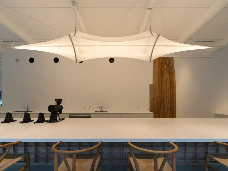 在這層帷幕之下,一個明亮的白色立方體空間映入眼簾。拋光石膏制成的柜臺仿佛懸浮于中央,其細(xì)膩的飾面與彈力織物燈具的柔和半透明質(zhì)感形成鮮明對比。光線與材質(zhì)的精妙平衡,營造出一種近乎失重的空靈氛圍,進(jìn)一步強(qiáng)化了咖啡館的縹緲理念。