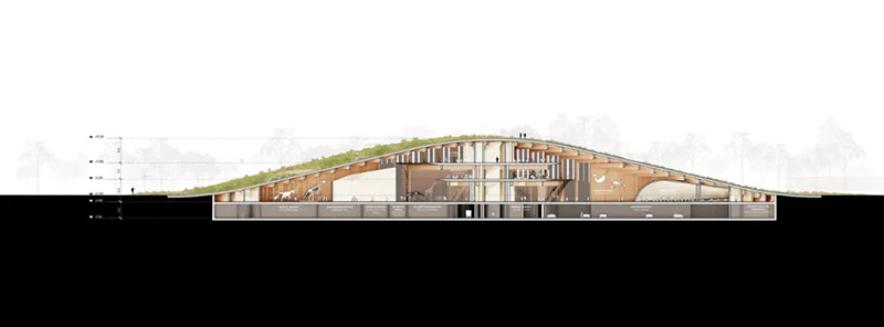 博物館的綠色屋頂種植了本地植物,旨在為當?shù)貏又参锾峁⒌兀瑫r在視覺上將公園延伸至建筑之上。此外,建筑融合了地熱循環(huán)系統(tǒng)和光伏板等現(xiàn)場能源系統(tǒng),確保全年室內氣候的穩(wěn)定。