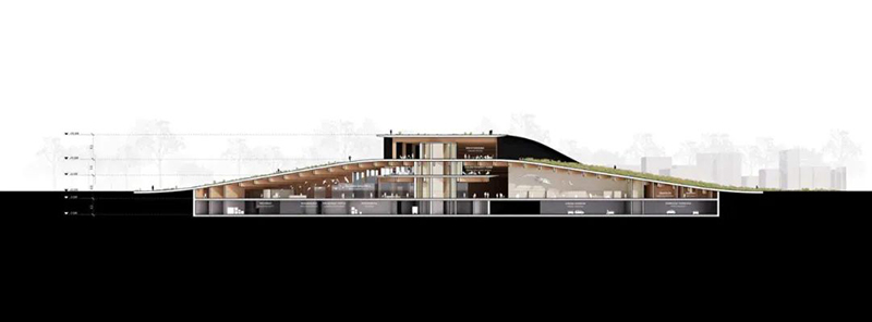 博物館的設計靈感源自三條相互交疊的景觀帶,這些帶狀結構從森林地面升起,形成一個與自然環(huán)境和諧融合的建筑形態(tài)。建筑采用大規(guī)模木結構,并以燒焦的木材作為外立面,使其部分嵌入地下,與周圍公園環(huán)境無縫銜接。傾斜的屋頂提供了廣闊的城市景觀。