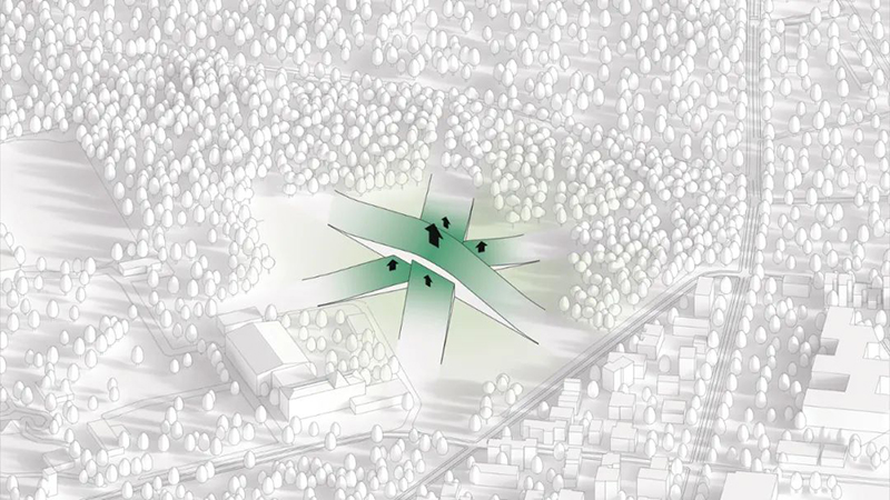 博物館從四面八方均可進入,南側廣場作為主要入口,既是社區(qū)活動的聚集地,也是博物館活動的中心點。蜿蜒的森林小徑和開放的廣場設計,引導游客自然地進入建筑內部,增強了與周圍環(huán)境的連通性。