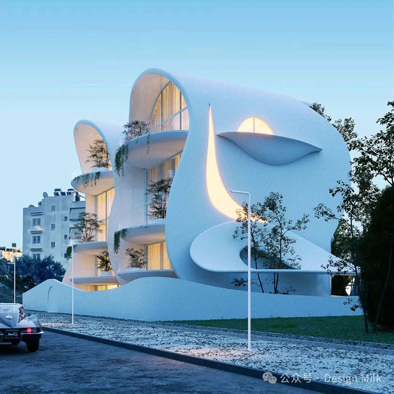 外表面光滑、潔白,加上精心布置的燈光,凸顯了建筑復(fù)雜的輪廓。 設(shè)計中融入了大型圓形開口和彎曲的陽臺,可以看到室內(nèi)景象,并提供與外部無縫融合的室外空間。 這些陽臺上裝飾著綠色植物,不僅增添了一絲自然氣息,也增強(qiáng)了建筑的有機(jī)美感。 整體效果既具有未來感又不失自然,營造出強(qiáng)烈的視覺沖擊。