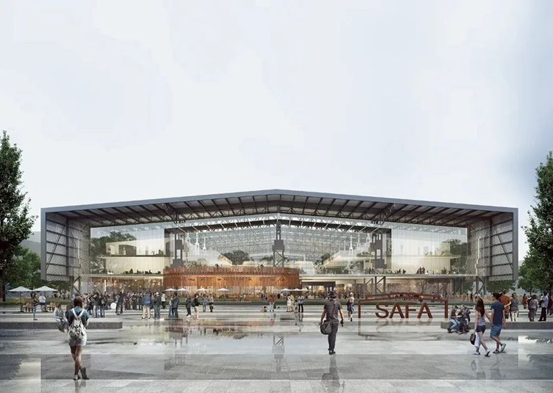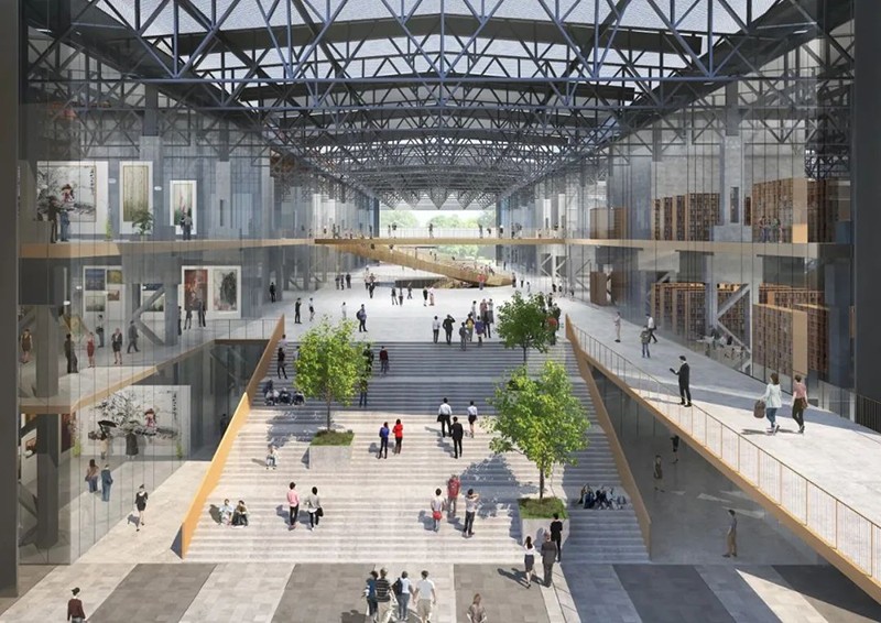 上海大學上海美術(shù)學院(吳淞院區(qū))項目位于上海市寶山區(qū)吳淞創(chuàng)新城,本項目以打造以藝術(shù)教育為核心、國際藝術(shù)人才和資源高度集聚的吳淞國際藝術(shù)城核心區(qū)為目標。在國際方案招標中,gmp建筑師事務(wù)所在本次競賽中標 ,設(shè)計以“時間回廊”為理念,對原廠房連續(xù)的柱網(wǎng)與屋架結(jié)構(gòu)進行了保留與重構(gòu),在還原其宏偉壯觀的空間尺度感的同時,也為轉(zhuǎn)型后的新功能場景增添一份屬于鋼鐵工業(yè)的熾熱記憶。原廠房從東至西綿延近一公里,屋脊上有序地排列著若干組氣樓,被視作型鋼廠房的重要標志。設(shè)計靈感便來源于這些氣樓。每當陽光照射進排列工整的氣樓,富有戲劇性的室內(nèi)空間便由此誕生。