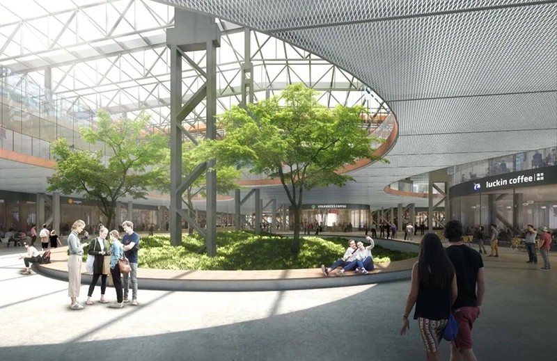 由于原址的工業(yè)機械設(shè)備,鋼結(jié)構(gòu),和通風氣樓均具備極高的保留價值,改造思路以“最大程度保留原廠房結(jié)構(gòu)”為主旨。在拆除老廠房的破損屋頂并使結(jié)構(gòu)露出后,氣樓內(nèi)被置入弧形不銹鋼板,使陽光反射到中庭,由此解決大尺度建筑中常見的采光不佳問題。