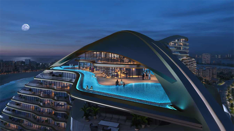 住宅部分包含950套精致住宅,涵蓋一至四居室公寓、復式公寓、頂層公寓及濱海別墅,其中75%以上戶型享有無遮擋的壯闊海景。住宅塔樓所處的42,000平方米基地內(nèi),規(guī)劃有園景花園、庭院、泳池、屋頂無邊泳池、360°觀景餐廳及配套的海灘俱樂部,為住戶提供一站式高端濱海生活體驗。