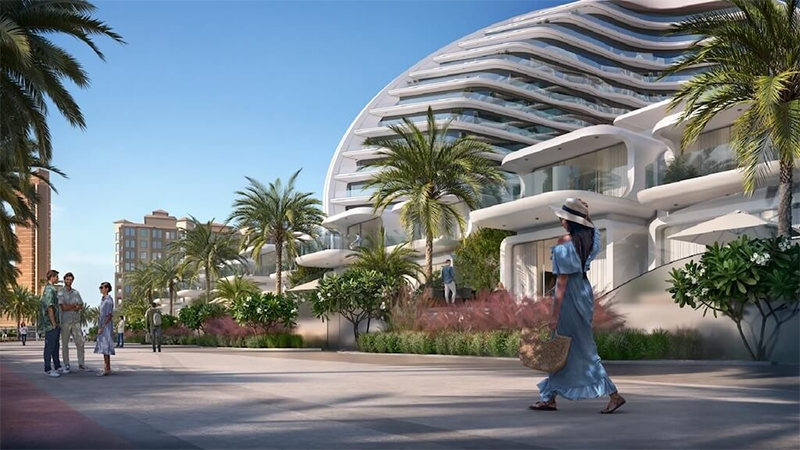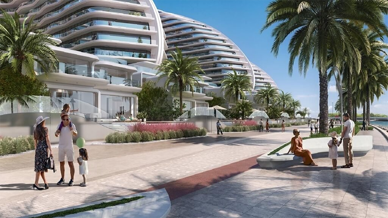 Oystra 同時融合商業(yè)與休閑功能,設(shè)置有購物長廊、餐飲區(qū)和健身娛樂中心。整個開發(fā)項目與 Al Marjan 島的濱海長廊無縫銜接,綠樹成蔭、海風拂面的步行系統(tǒng)讓居民可輕松通達島嶼各處。此外,項目引入海水冷卻系統(tǒng)與隔熱雙層外立面,有效應對高溫氣候,降低運營能源負荷。